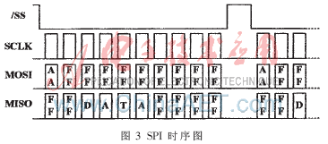 SPI接口中,LPC2136作為主控端,MLX90316作為從屬端。SPI通信模塊主要讓LPC2136讀取MLX90316的磁敏角度,SPI的通信過程為:主控端先輸出一個(gè)0xAA以及一個(gè)0xFF作為通信起始信號,接著輸出8個(gè)0xFF,而從端會同時(shí)輸出2個(gè)0xFF、4 B的角度信號以及4個(gè)0xFF,從而完成一次數(shù)據(jù)通信。具體的通信時(shí)序如圖3所示。