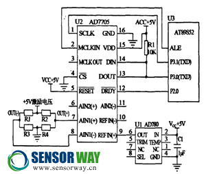 AD7705與單片機(jī)的接口電路如圖5所示。 扭矩測量系統(tǒng)由應(yīng)變測量橋路測得與扭矩成正比的電壓信號,將AD7705的CS直接連到低電平,于ST89S52單片機(jī)采用4線連接。單片機(jī)的ALE端輸出的是時鐘信號6分頻的脈沖序列,提供 給AD7705的時鐘輸人端,省去了晶振電路。為了 簡化程序,將AD7705的SCLK和單片機(jī)的P3. 1 連接,P3. 1用來輸出串行時鐘信號。DOUT和 DIN線接在一起并與P3. 0相連,片選端可直接接地,如果接口電路要控制CS信號,也可以接到單片機(jī)的輸出端口。