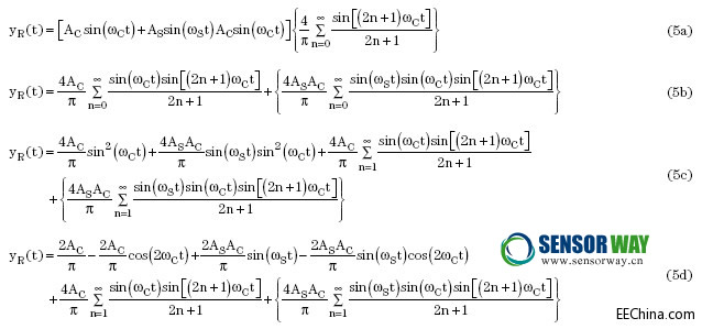 采用異步解調(diào)法時,可首先對傳感器信號進行整流。整流輸出隨后使用低通濾波器進行濾波。等式 1 中描述的信號全波整流輸出用數(shù)學(xué)式表達為: