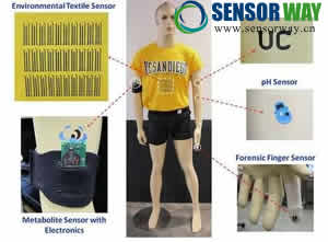 這項研究一開始是將可印式織物感測器縫進內(nèi)衣的彈性腰帶來進行測量。如圖所示,衣物上的多電極層能夠感測爆裂物,而手套上的“法醫(yī)手指”感測器則可用于在犯罪現(xiàn)場進行分析。