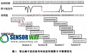 本文介紹的基于AMR磁阻傳感器和加速度傳感器ADXL202的電子羅盤,是捷聯(lián)式慣性導(dǎo)航系統(tǒng)中的一種。在電子羅盤系統(tǒng)中,單片機(jī)VRS51L3074完成對加速度傳感器輸出信號脈寬和周期的計數(shù),獲得車輛瞬時加速度值,然后利用三角函數(shù)關(guān)系計算出當(dāng)前位置相對于已知參考位置之間的橫滾和俯仰角度,進(jìn)行姿態(tài)解算,得到車輛的前進(jìn)方向和方位角。但是汽車電磁環(huán)境復(fù)雜,特別是汽車的震動和瞬時功率變化會對ADXL202輸出的占空比信號產(chǎn)生尖峰脈沖干擾,嚴(yán)重影響計數(shù)的精度。因此,抑制脈沖干擾在提高計數(shù)精度、增強(qiáng)系統(tǒng)性能方面顯得尤為重要。