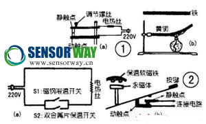 為什么磁鋼限溫開關(guān)在103℃時會自動斷開呢?通過參照圖2(b)所示的磁鋼限溫組件工作示意圖就可以明白了。按下按鍵后,動觸點接觸靜觸點而通電,同時,永久磁鋼與感溫軟磁體接觸,軟磁體被磁化而吸住永久磁鋼,這時手不需要按著按鍵,電路仍然接通。感溫軟磁體有一獨特性質(zhì),當(dāng)溫度達到103℃時,磁性便消失,不能吸住永久磁鋼。因此,當(dāng)鍋底溫度達到103℃時,永久磁鋼便因重力作用而下落,動觸點離開靜觸點而斷開電源,從而達到保護。