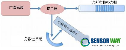 由于光纖布拉格光柵可以被植入不同的特定反射波長,所以可以利用它來實現(xiàn)良好的波分復用(WDM)技術。這個特性使得可以在一條長距離的獨立光纖上,以菊花鏈的形式連接多個不同的擁有特定布拉格波長的傳感器。波分復用技術在可用的光學廣譜中為每一個FBG傳感器分配了一個特定的波長范圍供其使用。由于光纖布拉格光柵固有的波長特性,就算在傳輸過程中由于光纖介質的彎曲和傳輸造成了光強的損耗和衰減,傳感器測得的結果也仍然能夠保持準確。