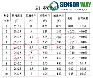 為了驗證所設(shè)計的風(fēng)速測量傳感器,搭建了簡易的實驗驗證平臺。實驗驗證平臺由EE66-VB5風(fēng)速計作為標(biāo)準(zhǔn)風(fēng)速計量單元,對所設(shè)計的傳感器和測量電路獲得的測量數(shù)據(jù)進(jìn)行對比。風(fēng)速計EE66-VB5是一種高精度的風(fēng)速測量傳感器,測量范圍:0~2m/s,輸出電壓:0~10V,風(fēng)速精度:± (0.1m/s+3%測量值),響應(yīng)時間:0.2秒,工作溫度:-10~+50℃。由于其很高的精度及靈敏度,因此該實驗把其測量的值作為真實值,將該風(fēng)速計和待測量傳感器置于相同的環(huán)境,在相同的風(fēng)速下,其測量值和鉑熱電阻組成的風(fēng)速傳感器測量值做比較。從而分析鉑熱電阻組成的風(fēng)速傳感器的性能。下面是分別在不同風(fēng)速下的輸出電壓,所測部分結(jié)果如表1所示。