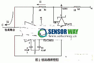 (2)、如果恒流源的電流值過小,在測試時(shí)輸出的信號就會(huì)很小,為了使測量的信號滿足A/D的要求就必須加大放大電路的放大倍數(shù),這樣就加大了系統(tǒng)的誤差。綜合考慮上述兩個(gè)原因,本系統(tǒng)中恒流源的電流值定為0.5mA。恒流源電路設(shè)計(jì)中使用了TLC2652高精度斬波穩(wěn)零運(yùn)算放大器[2]和電壓基準(zhǔn)源TL431。 TLC2652斬波穩(wěn)零的工作方式使其具有優(yōu)異的直流特性,失調(diào)電壓及其漂移、共模電壓、低頻噪聲等特點(diǎn)。TL431是一個(gè)有良好的熱穩(wěn)定性能的三端可調(diào)的電壓基準(zhǔn)源,它的輸出電壓可以在2.5V到36V范圍內(nèi)設(shè)置。