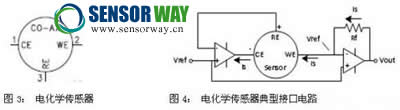 電化學(xué)式傳感器通常是電流方式輸出,信號(hào)的靈敏度從幾十nA/ppm到幾百nA/ppm,其數(shù)值根據(jù)氣體的種類(lèi)不同而不同。另外,不同廠(chǎng)家的傳感器也略有差異。此類(lèi)傳感器一般3個(gè)引腳,分別是工作電極(WE)/參考電極(RE)/對(duì)電極(CE)。 工作電極與對(duì)電極之間流動(dòng)的電流與氣體濃度成比例。參考電極沒(méi)有電極流動(dòng),只是提供一個(gè)參考電壓。對(duì)于不同氣體傳感器,參考電壓會(huì)有所不同,設(shè)計(jì)后端電路時(shí)要仔細(xì)閱讀產(chǎn)品手冊(cè)。