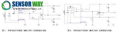 熱勢(shì)電是紅外傳感器中重要的一種,其傳感器及其典型接口電路如圖7和圖8所示,框中部分是傳感器,內(nèi)部集成有JFET和CMOS運(yùn)放兩種形式。對(duì)外部均需要精密運(yùn)算放大器對(duì)輸出的信號(hào)進(jìn)行調(diào)理。溫度的變化對(duì)于此類(lèi)傳感器影響較大,一般有溫度校正的環(huán)節(jié)。