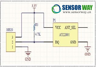 溫度采集單元主要有傳感器、處理器和電源組成,傳感器18B20負(fù)責(zé)區(qū)域內(nèi)溫度信息的采集和數(shù)據(jù)轉(zhuǎn)換,將溫度的傳感器信息經(jīng)過(guò)A/D轉(zhuǎn)換,得到數(shù)字信息,供處理器AX22001進(jìn)行處理。其原理圖如圖1所示,其中ANT_SEL引腳接天線,用來(lái)傳送無(wú)線信號(hào)。
