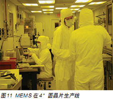 與傳統(tǒng)IC行業(yè)注重二維靜止的電路設(shè)計不同,MEMS以理論力學(xué)為基礎(chǔ),結(jié)合電路知識設(shè)計三維動態(tài)產(chǎn)品。對于在微米尺度進(jìn)行機(jī)械設(shè)計會更多地依靠經(jīng)驗(yàn),設(shè)計開發(fā)工具(Ansys)也與傳統(tǒng)IC(如EDA)不同。MEMS加工除了使用大量傳統(tǒng)的IC工藝,還需要一些特殊工藝,如雙面刻蝕,雙面光刻等。MEMS比較傳統(tǒng)IC,工藝簡單,光刻步驟少,MEMS生產(chǎn)的一些非標(biāo)準(zhǔn)的特殊工藝,工藝參數(shù)需要按照產(chǎn)品的要求來進(jìn)行調(diào)整。由于需要產(chǎn)品設(shè)計、工藝設(shè)計和生產(chǎn)三方面的密切配合,IDM的模式要優(yōu)于Fabless+Foundry的模式。MEMS對封裝技術(shù)的要求很高。傳統(tǒng)半導(dǎo)體廠商的4〃生產(chǎn)線正面臨淘汰,即使用來生產(chǎn)LDO,其利潤也非常低,但是,如果生產(chǎn)MEMS,則可獲得較高的利潤。4〃線上的每一個圓晶片可生產(chǎn)合格的MEMS壓力傳感器Die5-6K個,每個出售后,可獲成本7-10倍的毛利(如圖10)。轉(zhuǎn)產(chǎn)MEMS對廠家的工藝要求改動不大,新增輔助設(shè)備有限,投資少、效益高。MEMS芯片與IC芯片整合封裝是集成電路技術(shù)發(fā)展的新趨勢,也是傳統(tǒng)IC廠商的新機(jī)遇。圖11是MEMS在4〃圓晶片生產(chǎn)線上。