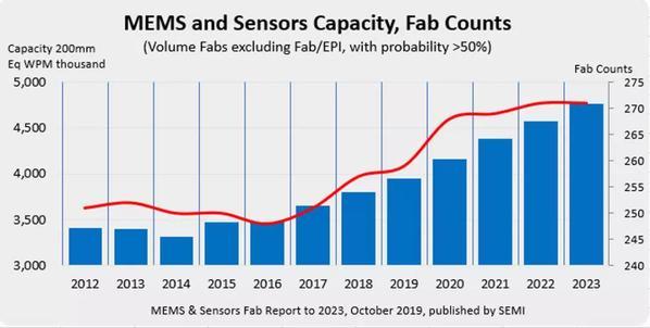 據(jù)全球半導(dǎo)體生產(chǎn)設(shè)備材料協(xié)會(huì)(SEMI)日前發(fā)布的報(bào)告預(yù)測(cè)顯示,2018年-2023年期間,生產(chǎn)MEMS/Sensor(傳感器)的Fab的產(chǎn)能將會(huì)增加25%,月產(chǎn)能增至470萬(wàn)片(以200nm晶圓換算)。這是受到通信、汽車、醫(yī)療、移動(dòng)、工業(yè)和物聯(lián)網(wǎng)(IoT)等其他應(yīng)用需求的驅(qū)動(dòng)。