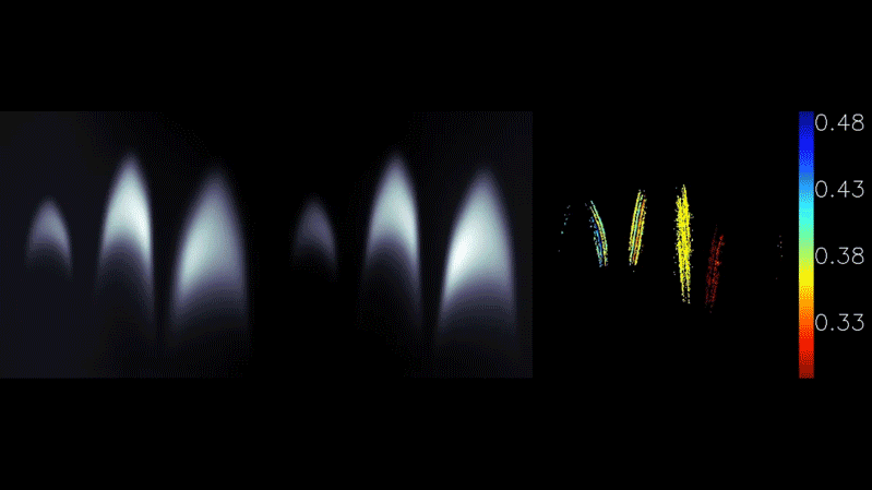 圖片顯示了金屬深度傳感器實(shí)時(shí)工作,以捕獲透明蠟燭火焰的深度。左側(cè)的兩個(gè)圖像是在相機(jī)傳感器上捕獲的原始圖像。它們由金屬元素形成,并且模糊程度略有不同。研究人員從這兩幅圖像中實(shí)時(shí)計(jì)算出物體的深度。右圖顯示了計(jì)算出的深度圖。圖片來(lái)源:郭琦和石柱君/哈佛大學(xué)