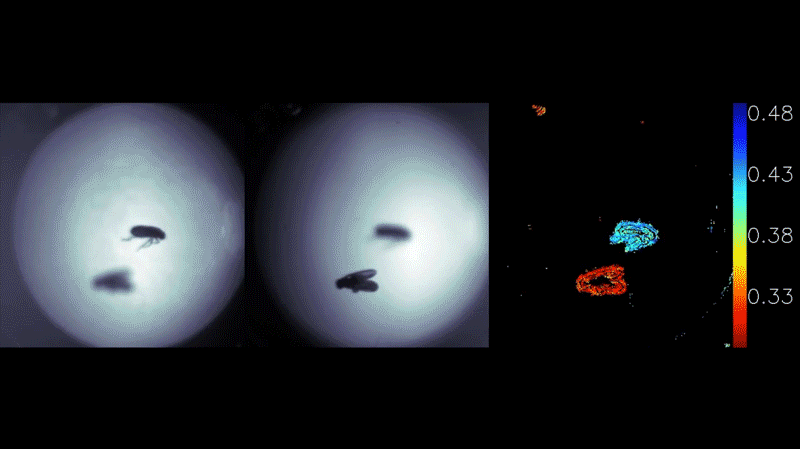 視頻顯示了金屬化深度傳感器實(shí)時(shí)工作以捕獲果蠅的深度。左側(cè)的兩個(gè)圖像是在相機(jī)傳感器上捕獲的原始圖像。它們由金屬元素形成,并且模糊程度略有不同。研究人員從這兩幅圖像中實(shí)時(shí)計(jì)算出物體的深度。右圖顯示了計(jì)算出的深度圖。圖片來(lái)源:郭琦和石柱君/哈佛大學(xué)