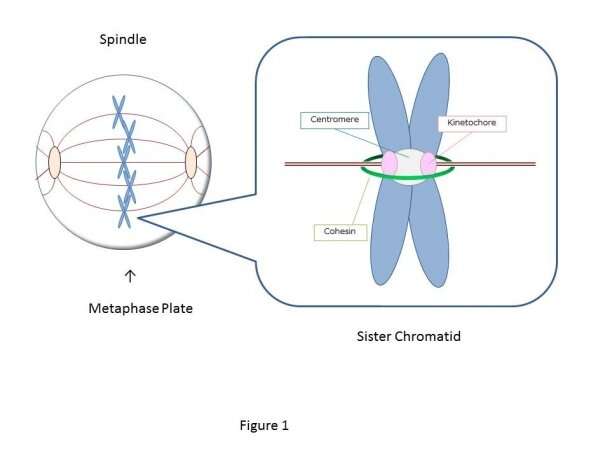 復(fù)制的染色體由稱為粘著蛋白(綠色)的環(huán)狀蛋白質(zhì)配對(duì)在一起,并成為姐妹染色單體。在姐妹染色單體中有兩個(gè)動(dòng)植物(粉紅色:姐妹動(dòng)植物),當(dāng)從相反的紡錘極延伸的繩狀微管捕獲每個(gè)動(dòng)粒時(shí),產(chǎn)生張力,并且染色體在中期板上對(duì)齊。來源:早稻田大學(xué)寺田實(shí)驗(yàn)室