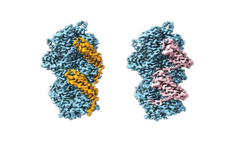 細(xì)胞粘附蛋白長(zhǎng)鏈蛋白(左,橙色)和α-連環(huán)蛋白(右,粉紅色)與肌動(dòng)蛋白絲(藍(lán)色)結(jié)合的低溫電子顯微鏡重建。圖片來(lái)源:洛克菲勒大學(xué)