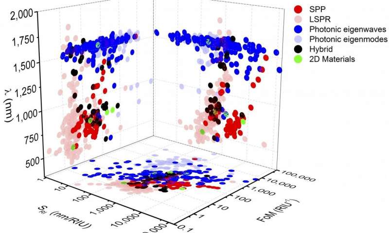 來自新加坡新加坡科技設計大學(SUTD),新加坡科學技術研究局(A * STAR)和奧地利奧地利技術學院的研究人員進行了廣泛的文獻研究,系統地總結和比較了傳感能力這些光學折射率傳感器的靈敏度和優(yōu)劣系數的比較。然后建立了3-D技術圖(見圖1),以定義使用等離子和光子結構的光學折射率傳感器的標準和發(fā)展趨勢。