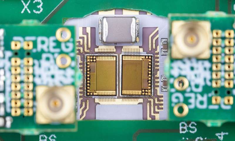 具有集成晶體管,柵極驅(qū)動(dòng)器,二極管以及用于狀態(tài)監(jiān)控的電流和溫度傳感器的GaN功率IC。圖片來源:Fraunhofer IAF