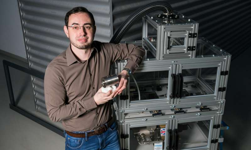 工程學畢業(yè)生Marco Schott是Schütze教授團隊的博士生,他正在研究氫氣測量池,并配備了高壓測試裝置,該裝置將在漢諾威工業(yè)博覽會上展出。圖片來源:Oliver Dietze