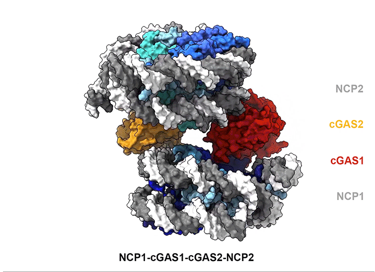 迄今為止,人們認為cGAS主要在細胞質(zhì)中起作用,可以檢測外來的非自身DNA(例如病毒)。但是最近的研究表明,核內(nèi)也存在cGAS。考慮到該酶可能被其自身的DNA激活,從而引發(fā)針對其自身的DNA的有害炎癥反應,這令人費解。這項觀察結(jié)果引起了Thom小組的研究人員的興趣,他們使用結(jié)構(gòu)生物學作為發(fā)現(xiàn)工具,發(fā)現(xiàn)cGAS以非活性狀態(tài)存在于細胞核中。他們與EPFL的Ablasser實驗室合作,研究了細胞中染色質(zhì)對cGAS失活的機制。