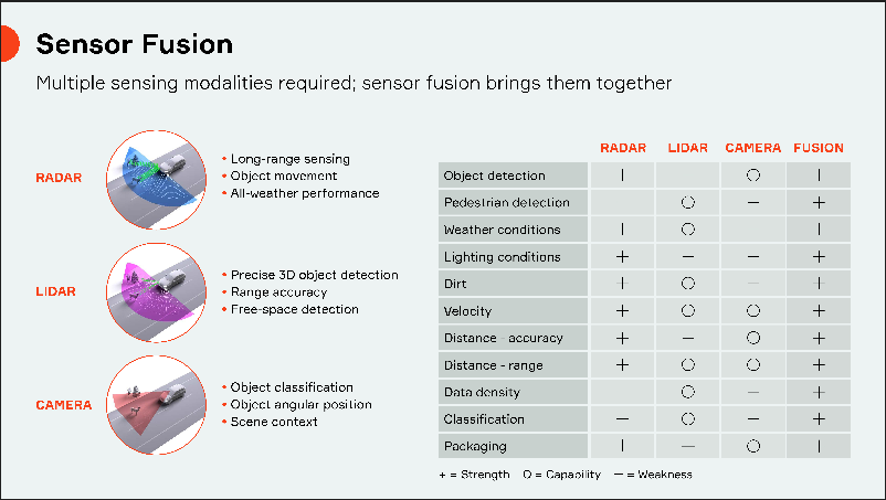 每種傳感器類型或“模態(tài)”都有其固有的優(yōu)點(diǎn)和缺點(diǎn)。雷達(dá)即使在惡劣的天氣條件下也能準(zhǔn)確確定距離和速度,但非常強(qiáng)大,但無法讀取路牌或“看到”交通信號(hào)燈的顏色。相機(jī)可以很好地讀取標(biāo)志或?qū)ξ矬w進(jìn)行分類,例如行人,騎自行車的人或其他車輛。但是,它們很容易被灰塵,陽光,雨水,雪或黑暗所蒙蔽。激光雷達(dá)可以準(zhǔn)確地檢測(cè)物體,但是它們沒有相機(jī)或雷達(dá)的承受能力或承受能力。