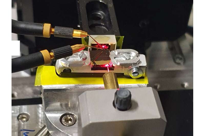 實驗裝置:使用紅色對準激光器來觀察從光纖到光波導的光束路徑及其在金鏡上的反射。兩個微探針用于接觸光電導體,其尺寸在亞波長范圍內(nèi)。來源:Empa