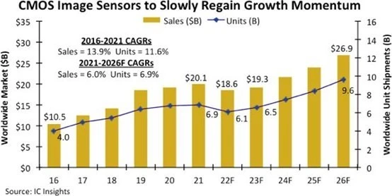手機市場在為圖像傳感器市場帶來豐厚營收的同時,也讓圖像傳感器行業(yè)不得不面臨智能手機需求疲軟的壓力。根據(jù) Counterpoint 的預(yù)測,2022 年上半年移動圖像傳感器的出貨量將同比下降 14% (Yole 的數(shù)據(jù)則為 10%)。同時,IC insights 更表示受到手機市場的需求不足的影響,在 2022 年,整個圖像傳感器營收可能迎來 13 年來的首次下跌。