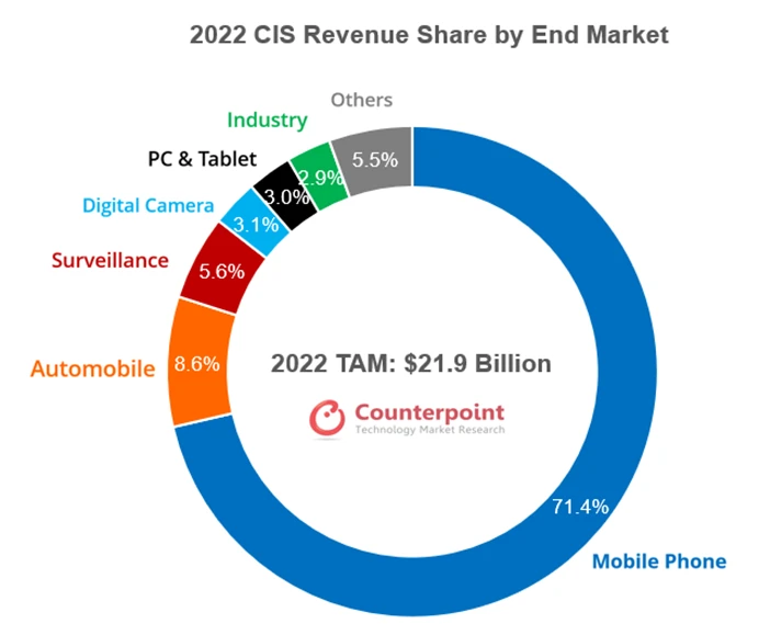 自從 20 多年前手機開始搭載相機模組以來,智能手機憑借著驚人的出貨量,逐漸成為圖像傳感器的頭號用戶。根據(jù) Counterpoint 今年的預(yù)測數(shù)據(jù),在 2022 年圖像傳感器的總營收中有高達 71.4% 是由手機貢獻的。