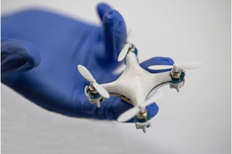 傳感器可以呈現(xiàn)出看似無窮無盡的各種形式。為了證明這一點,研究小組創(chuàng)造了病毒傳感無人機(jī),其中的機(jī)身嵌入了傳感器材料。在飛行過程中,螺旋槳引導(dǎo)氣流通過無人機(jī)的多孔主體,著陸后可以對其進(jìn)行檢查。在示例中,無人機(jī)對空氣傳播的病原體(SARS-CoV-2)做出反應(yīng),可以從遠(yuǎn)程距離監(jiān)測環(huán)境。