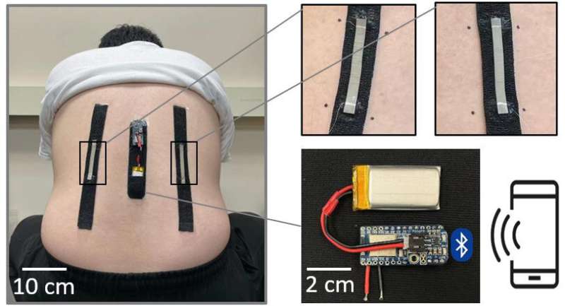 為了證明傳感器可以變形多遠,研究人員創(chuàng)造了一種可穿戴設(shè)備,用于監(jiān)測人的背部運動,該設(shè)備可用于物理治療。來源:吳爽,北卡羅來納州立大學