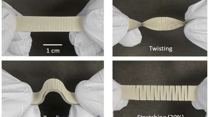 新傳感器由嵌入彈性聚合物中的銀納米線網(wǎng)絡(luò)組成。聚合物具有均勻深度的平行切割圖案,從材料的任一側(cè)交替:從左側(cè)切割一個,然后從右側(cè)切割一個,然后從左側(cè)切割一個,依此類推。