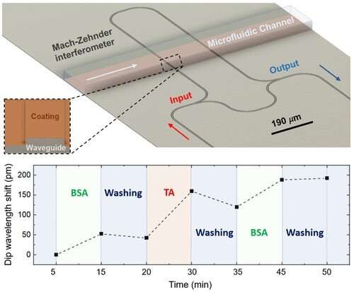 在實(shí)驗(yàn)中,研究人員將蛋白質(zhì)和單寧酸薄膜逐層沉積到PIC的敏感表面上。通過(guò)微流體通道泵送牛血清白蛋白后,他們用去離子水沖洗掉多余的白蛋白,泵入單寧酸,重新涂覆蛋白質(zhì)涂層,并使用干涉儀的光學(xué)讀數(shù)實(shí)時(shí)分析每層的沉積過(guò)程。
