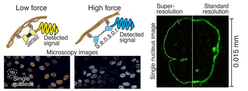 細(xì)胞內(nèi)力傳感器的作用原理為左。熒光蛋白(黃色和青色)來自水母,而橡皮筋部分(黑色)利用了蜘蛛網(wǎng)蛋白。靶蛋白結(jié)合抗體(深棕色)來源于羊駝。右圖是超分辨率顯微鏡和常規(guī)顯微鏡對(duì)細(xì)胞核成像的比較。資料來源:坦佩雷大學(xué)Teemu Ihalainen