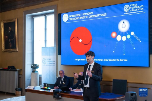 10月4日,在瑞典斯德哥爾摩的2023年諾貝爾化學(xué)獎(jiǎng)公布現(xiàn)場(chǎng),評(píng)委會(huì)專家解讀今年諾貝爾化學(xué)獎(jiǎng)得主的研究成果。新華社發(fā)(魏學(xué)超 攝)