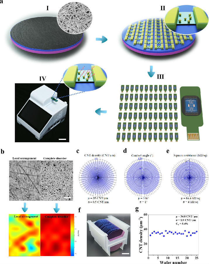 團隊逐點解決CNT材料制備、生物傳感器制造、芯片封裝和信號讀取等技術(shù)難點,打造CNT FET生物傳感器的完整鏈技術(shù),并為其在POCT領(lǐng)域的應(yīng)用開發(fā)堅實的技術(shù)基礎(chǔ)。具體而言,在材料制備上,通過改進的浸漬涂層技術(shù)制備了高質(zhì)量和均勻性的隨機取向半導(dǎo)體CNT薄膜(圖1)。