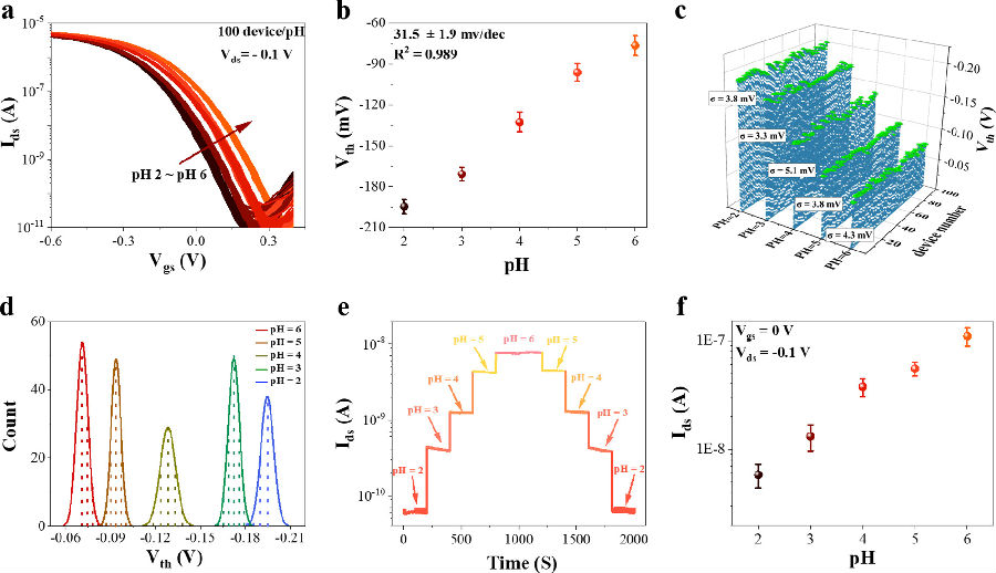 課題組進一步驗證了基于CNT FET的離子傳感器的可重復(fù)性,在每個固定的離子濃度下,所測試的傳感器(100個)閾值電壓的標(biāo)準(zhǔn)偏差在5.1 mV以內(nèi),這意味能夠通過直接測試傳感器的漏極電流來讀取待測溶液的離子濃度信息(圖4)。