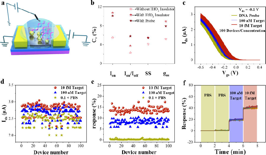 在此基礎(chǔ)上,課題組發(fā)展了CNT FET生物傳感器劃片、封裝的標(biāo)準(zhǔn)工藝流程,并專門開發(fā)了用于FET生物傳感器信號讀出的專用便攜式設(shè)備,可實現(xiàn)生物傳感芯片的即插即用,操作界面友好,非專業(yè)人員亦可根據(jù)簡單的說明書實現(xiàn)生物目標(biāo)的探測。課題組還展示了通過該便攜式高效檢測系統(tǒng),優(yōu)化檢測方式和數(shù)據(jù)處理方式,CNT FET生物傳感器可在空白背景下檢測濃度低至100 aM的生物信號(圖5)。