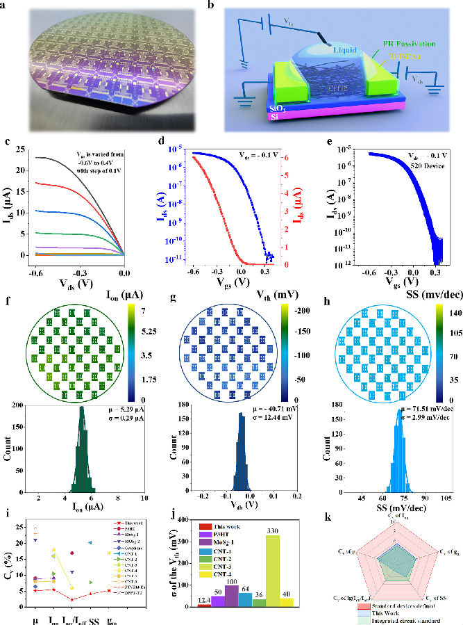在器件制備上,通過優(yōu)化CNT FET生物傳感器的制備工藝,實現(xiàn)了4英寸晶圓碳基FET批量制備,并大幅度提升了器件均勻性,晶圓內(nèi)器件性能變化系數(shù)優(yōu)于6%,晶圓間器件性能變化系數(shù)在9%以內(nèi)(圖2、圖3)。