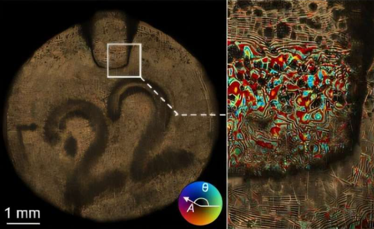 MASI成像技術(shù)拍攝的彈殼圖像。上圖:捕獲的復(fù)雜電場包含振幅(亮度)和相位(顏色)信息。下圖:該數(shù)據(jù)能夠以微米級分辨率進(jìn)行三維重建,顯示擊針印痕——這一獨(dú)特的標(biāo)記可以將彈殼與特定槍支聯(lián)系起來。圖片來源:康涅狄格大學(xué)
