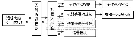 基于遠(yuǎn)程腦的類人機(jī)器人本體采用模塊化設(shè)計(jì),其結(jié)構(gòu)框圖如圖1所示,包括智能模塊(小腦)、無線通訊模塊、機(jī)械手控制及驅(qū)動(dòng)模塊、車體運(yùn)動(dòng)控制及驅(qū)動(dòng)模塊、傳感器信號采集及處理模塊、語音模塊等。