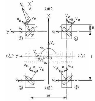 本文所研究的行走載體,由麥卡納姆輪系(Mecanum wheels)構(gòu)成。麥卡納姆輪系是移動(dòng)機(jī)器人中常用的全方位移動(dòng)機(jī)構(gòu),它可沿任意平面方向靈活運(yùn)動(dòng),尤其具有左右橫移和原地僅以自身半徑轉(zhuǎn)動(dòng)的獨(dú)一無二的功能[6-7]。
