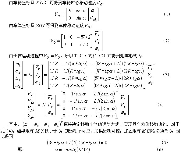 車體采用四輪移動(dòng)機(jī)構(gòu),四個(gè)麥卡納姆車輪分別由四個(gè)直流電機(jī)獨(dú)立驅(qū)動(dòng),通過對這四個(gè)電機(jī)轉(zhuǎn)速的控制,就可以實(shí)現(xiàn)其橫向、縱向、繞自身中心旋轉(zhuǎn)以及斜向等移動(dòng)。每個(gè)麥卡納姆車輪由兩部分組成:主動(dòng)的輪轂和輪轂外緣按一定傾斜方向均勻分布的多個(gè)被動(dòng)滾輪組成。