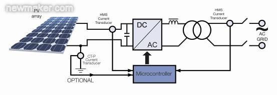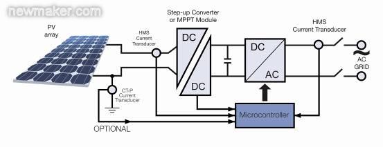 通常在剛好在PV 方陣后使用最大功率點(diǎn)跟蹤(MPPT)組件來確保方陣工作在其最大功率運(yùn)行水平。通過使用用于跟蹤功能的電流和電壓傳感器,應(yīng)用一種特殊軟件算法和專用電子元件一起來控制電池板(電池)的工作點(diǎn)。一般來說,一臺電流傳感器可用于測量單相輸出(供到電網(wǎng)的電流),而另一臺傳感器可用于測量輸入直流電流(10-25A)。在三相輸出的情況下,兩臺傳感器可用于測量三相輸出的交流電流。接入電網(wǎng)的DC/AC逆變器是一臺將直流信號轉(zhuǎn)換為正弦波的全橋逆變器。