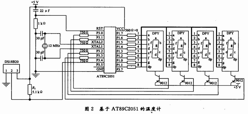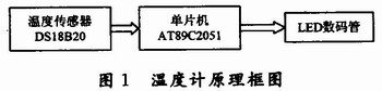 由AT89C2051構(gòu)成的溫度計(jì)主要由三部分組成:DSl8B20溫度傳感器、單片機(jī)AT89C2051、由LED數(shù)碼管構(gòu)成的顯示模塊。其系統(tǒng)原理框圖如圖1所示。DSl8B20作為單片機(jī)AT89C2051的外部信號(hào)源,把所采集到的溫度轉(zhuǎn)換為數(shù)字信號(hào),通過I/O接口傳給2051,2051啟動(dòng)ROM內(nèi)的控制程序驅(qū)動(dòng)LED數(shù)碼管,通過I/O接口和數(shù)據(jù)線(單片機(jī)和數(shù)碼管的接口)把數(shù)據(jù)傳送給數(shù)碼管,將采集到的溫度顯示出來。