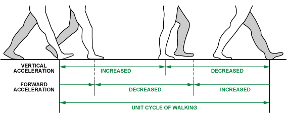 用戶在水平步行運(yùn)動(dòng)中,垂直和前進(jìn)兩個(gè)加速度會(huì)呈現(xiàn)周期性變化,如圖所示。在步行收腳的動(dòng)作中,由于重心向上單只腳觸地,垂直方向加速度是呈正向增加的趨勢,之后繼續(xù)向前,重心下移兩腳觸底,加速度相反。水平加速度在收腳時(shí)減小,在邁步時(shí)增加。