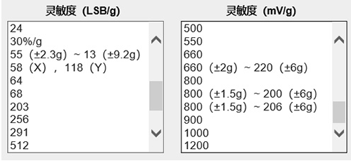 靈敏度(LSB/g<)主要針對(duì)數(shù)字輸出加速度傳感器,代表一個(gè)重力加速度(g)下,輸出能區(qū)分多少位LSB。上面已經(jīng)根據(jù)應(yīng)用要求推導(dǎo)出,假設(shè)應(yīng)用要求最小分辨率為1°,靈敏度需要大于58LSB/g。那么可以根據(jù)這一結(jié)果直接在參數(shù)欄里選擇。