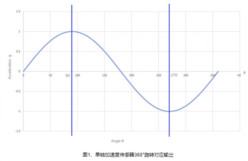 對(duì)于單軸加速度傳感器,加速度傳感器的輸出為Ax=sin(θ)*1g,如果檢測軸與重力平面沒有很好的對(duì)齊,會(huì)影響重力加速度在檢測軸上的分量,從而影響檢測精度。