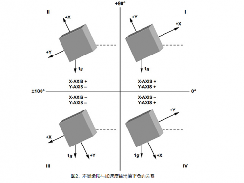 雙軸加速度傳感器在檢測傾斜角時(shí),由于靈敏度基本恒定,相比較單軸加速度傳感器而言,減小了對(duì)加速度傳感器靈敏度的要求。同時(shí),雙軸加速度傳感器不需要與重力平面對(duì)齊,并且實(shí)現(xiàn)了360°傾斜角檢測。