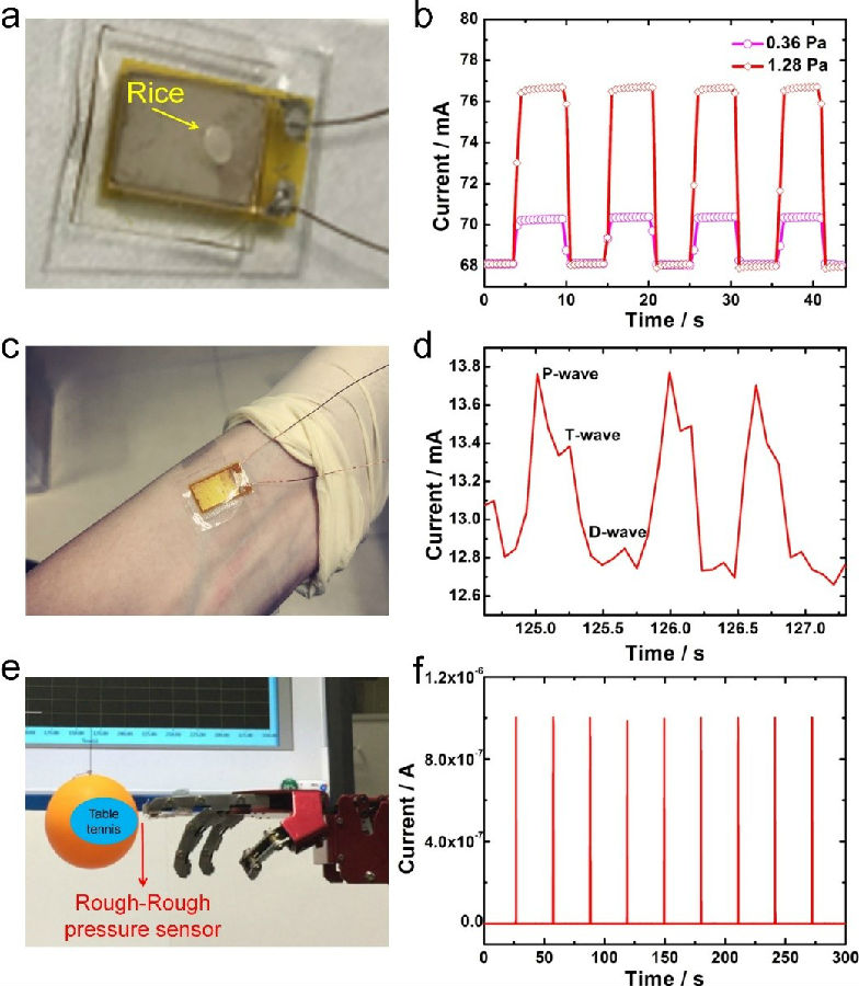 圖2. “粗糙-粗糙”型傳感器應(yīng)用:(a-b)傳感器用于檢測(cè)微弱壓力(米粒),檢測(cè)極限可以達(dá)到0.36 Pa (c-d) 傳感器用于健康監(jiān)控:實(shí)時(shí)監(jiān)測(cè)人體脈搏(e-f)傳感器用于智能機(jī)器人:實(shí)時(shí)監(jiān)測(cè)懸掛乒乓球的輕微擺動(dòng)