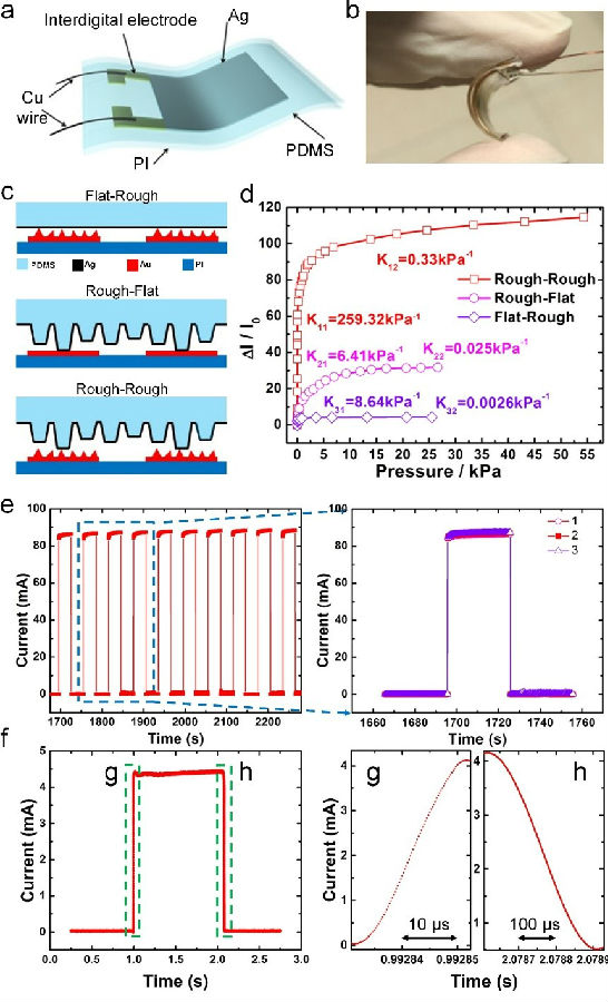 圖1. 微結(jié)構(gòu)壓力傳感器傳感特性:(a-b)制備的壓力傳感器具備良好的機(jī)械柔韌性 (c-d)不同微結(jié)構(gòu)的壓力傳感器傳感特性,其中“粗糙-粗糙”型傳感器具備超高的靈敏度及最寬的動(dòng)態(tài)范圍(e)“粗糙-粗糙”型壓力傳感器具備良好的穩(wěn)定性(f)“粗糙-粗糙”型壓力傳感器的響應(yīng)和恢復(fù)時(shí)間