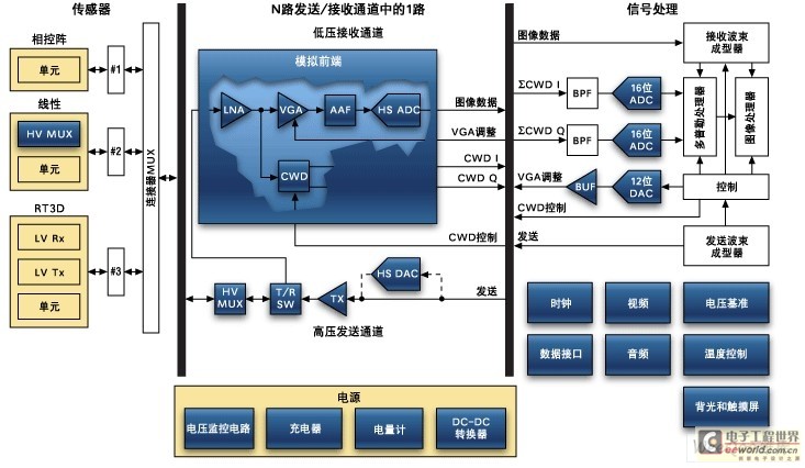 通過發(fā)射超聲能量進入人體,接收并處理返回的反射信號,相控陣超聲系統(tǒng)可以生成體內(nèi)器官和結(jié)構(gòu)的圖像,映射血液流動和組織運動,同時提供高準確度的血流速度信息。傳統(tǒng)設(shè)計中,構(gòu)建這樣的成像系統(tǒng)需要大量的高性能相控陣發(fā)射器和接收器,使得車載設(shè)備體積龐大且價格昂貴。近年來,隨著集成工藝的進步,設(shè)計人員能夠獲得小尺寸、低成本而且高度便攜的成像系統(tǒng)方案,并可達到接近大型成像設(shè)備的性能指標。而新的設(shè)計挑戰(zhàn)依然存在,即在進一步提高方案集成度的同時提高系統(tǒng)性能和診斷能力。