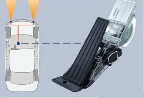 (1)通過車距傳感器的反饋信號,ACC控制單元可以根據(jù)靠近車輛物體的移動速度判斷道路情況,并控制車輛的行駛狀態(tài);通過反饋式加速踏板(圖3)感知的駕駛者施加在踏板上的力,ACC控制單元可以決定是否執(zhí)行巡航控制,以減輕駕駛者的疲勞。